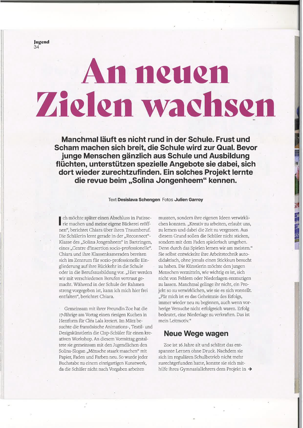 Client CISP Solina, Centre d’Insertion Socio-Professionnelle, Luxembourg Projet Social, Culturel ︎︎︎ Atelier Participatif Année 2025 Objectif Découvrir la broderie Création Proposition de customisation de lettres en papier afin de créer le slogan de l’école MËNSCHE STAARK MAACHEN « Renforcer les Humains », qui sera visible dans le hall de l’entrée du lieu. Solina est un Centre d’Insertion Socio-Professionnelle (CISP) qui accueille des jeunes à la recherche d’une (ré) orientation scolaire et/ ou professionnelle adéquate. Merci aux équipes multidisciplinaires qui se sont mobilisées pour collaborer à ce projet (éducateurs, formateurs- métiers, enseignants, pédagogue).
