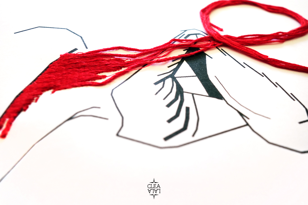 Impression jet d'encre noir, broderie machine et main coton rouge
