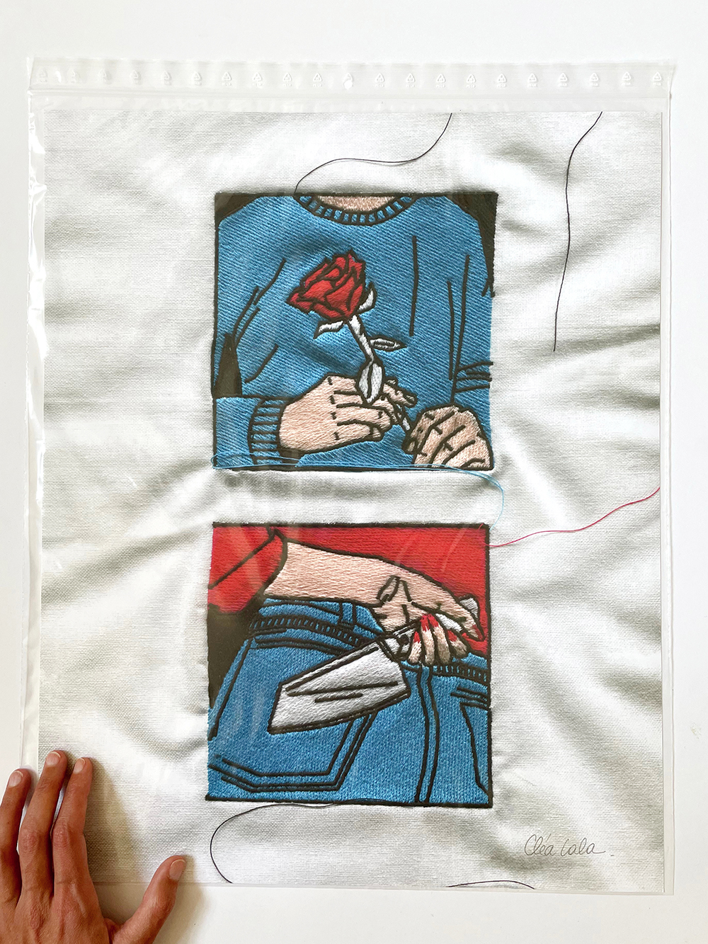 Projet Personnel Année 202O Thèmes Société, Amour, Relation Création Illustration, Broderie Support Textile Technique Broderies 9cm x 9cm machine et main sur toile de coton blanc