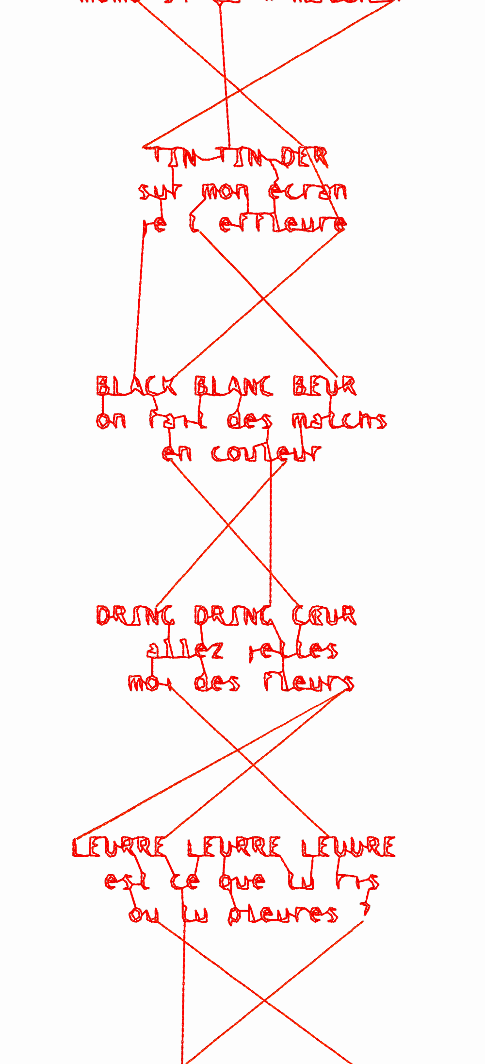jusqu’à devenir des lignes qu’on suit; puis elles relient un autre message; une autre chemise, un autre personnnage. Séparés mais unis. Le message s’envole pour former la signature.
