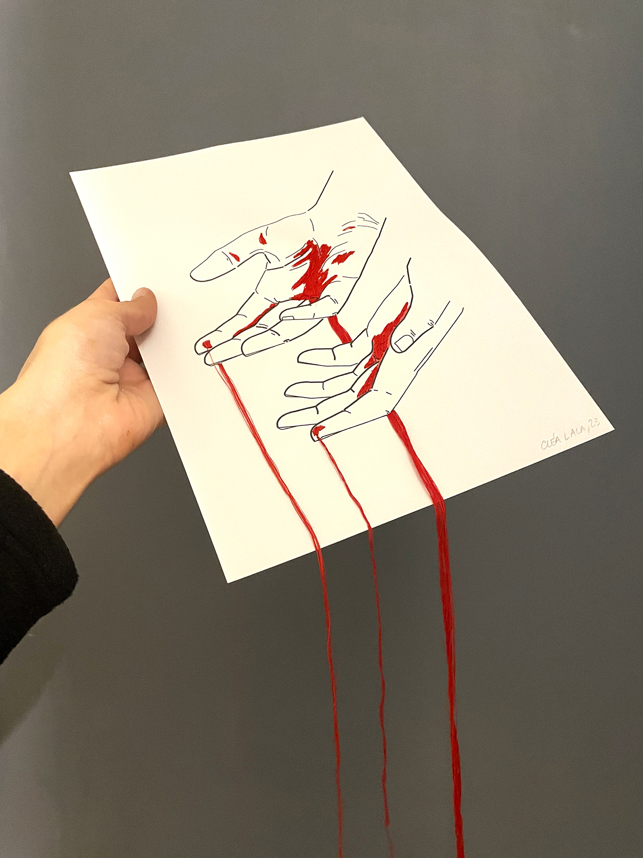 Projet Personnel Année 2023 Thèmes Corps, Sport, Société, Mental, Émotion Création Illustration, Broderie Technique Impression jet d'encre noir, broderie machine et main coton rouge Support Papier bristol blanc Format 21cm x 29,7cm ++ (Hauteur avec fils env. 70 cm) ︎ Signé, livré avec un certificat d'authenticité ︎ SOLD OUT